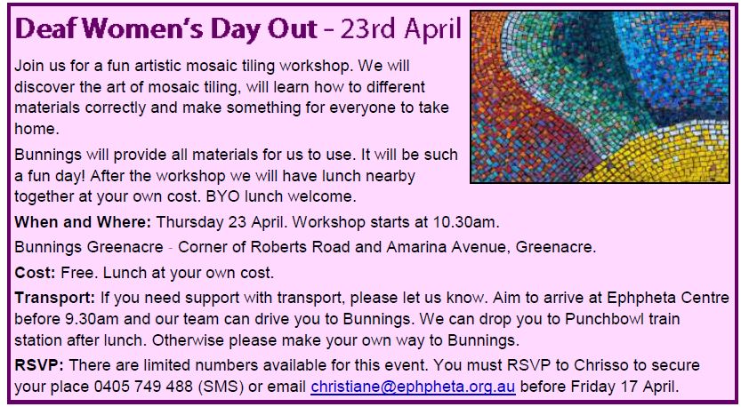 RSVP: There are limited numbers available for this event. You must RSVP to Chrisso to secure your place 0405 749 488 (SMS) or email christiane@ephpheta.org.au before Friday 17 April.